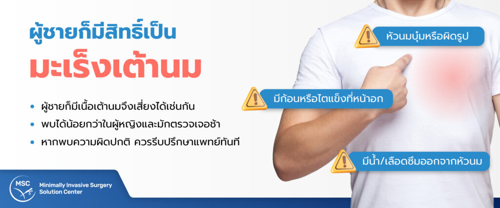 “มะเร็งเต้านม” มักถูกมองว่าเป็นโรคของผู้หญิงเท่านั้น แต่ความจริงแล้ว “ผู้ชาย” ก็สามารถเป็นได้ แม้จะพบได้น้อยกว่าในผู้หญิงถึง 100 เท่าก็ตาม (ประมาณ 1% ของผู้ป่วยมะเร็งเต้านมทั้งหมด) อาการที่พบบ่อยคือ มีก้อนแข็งใต้หัวนมหรือบริเวณเต้านม หัวนมบุ๋ม หรือมีของเหลวไหลออกจากหัวนม และที่สำคัญคือมักถูกตรวจพบในระยะที่ลุกลามแล้ว เนื่องจากความไม่รู้และไม่ได้ระวังเหมือนผู้หญิง ดังนั้น ผู้ชายก็ควรสังเกตอาการผิดปกติที่เกิดขึ้นกับตนเองด้วยเช่นกัน